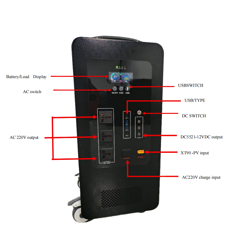 - Interruptor de CA :3 modos (ENCENDIDO/APAGADO/CARGA) para un fácil control de la salida de CA de 220 V, adecuado para respaldo doméstico y uso en exteriores.